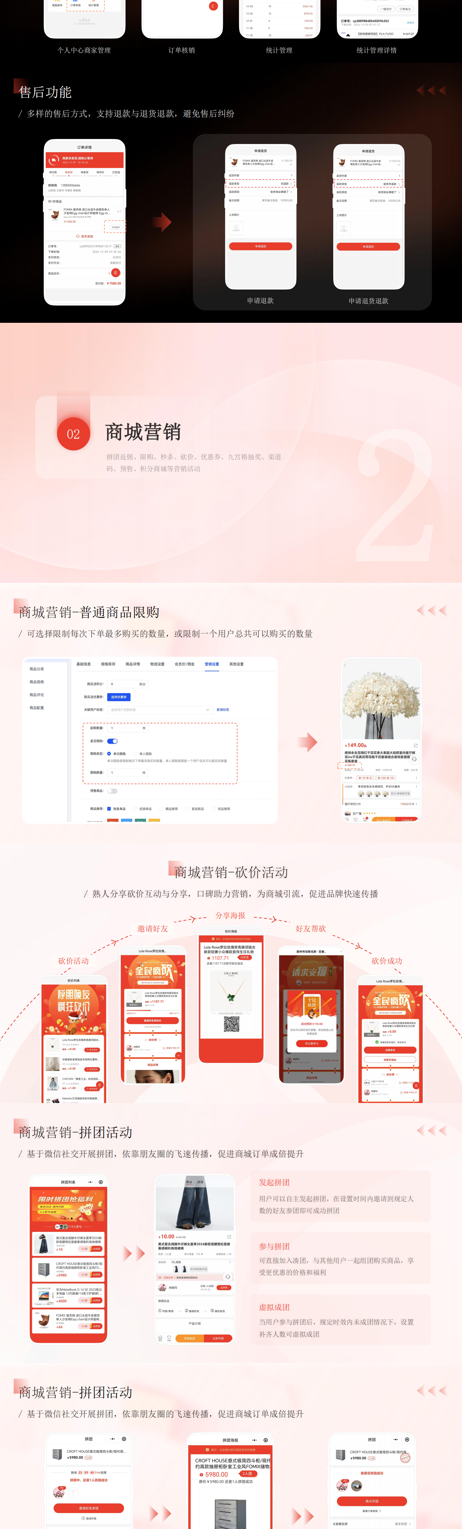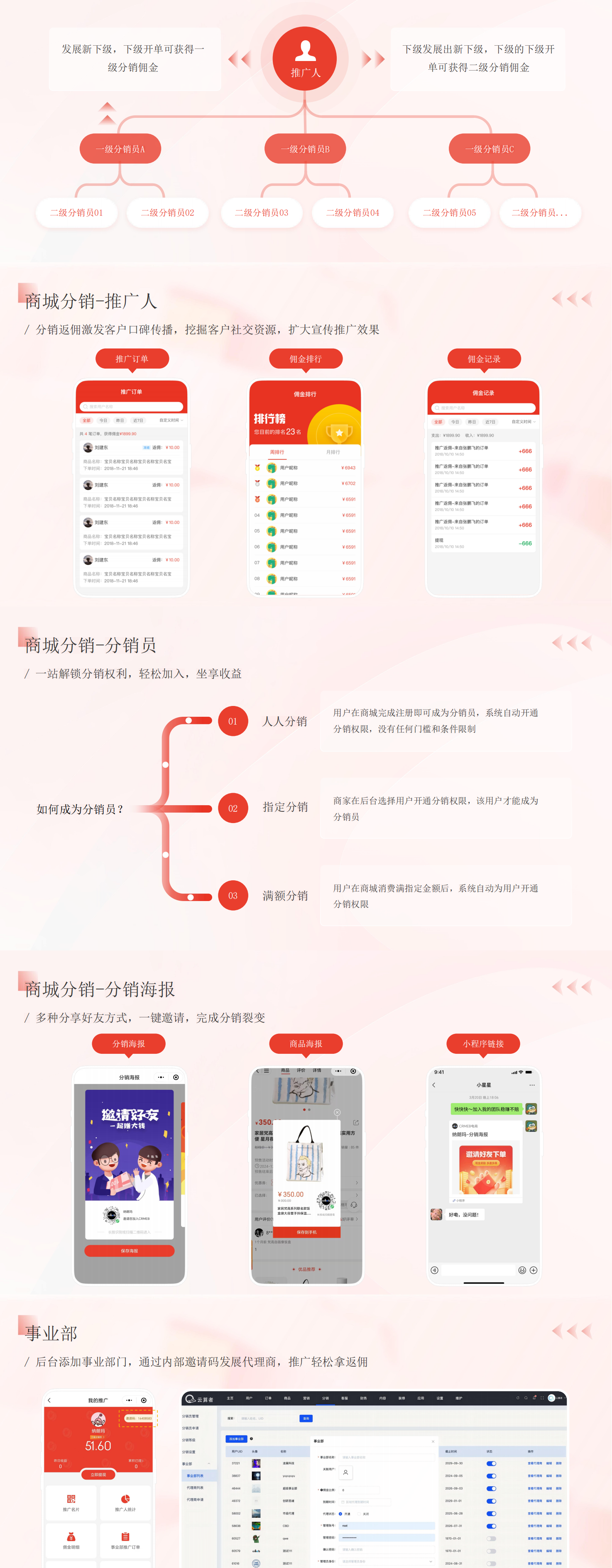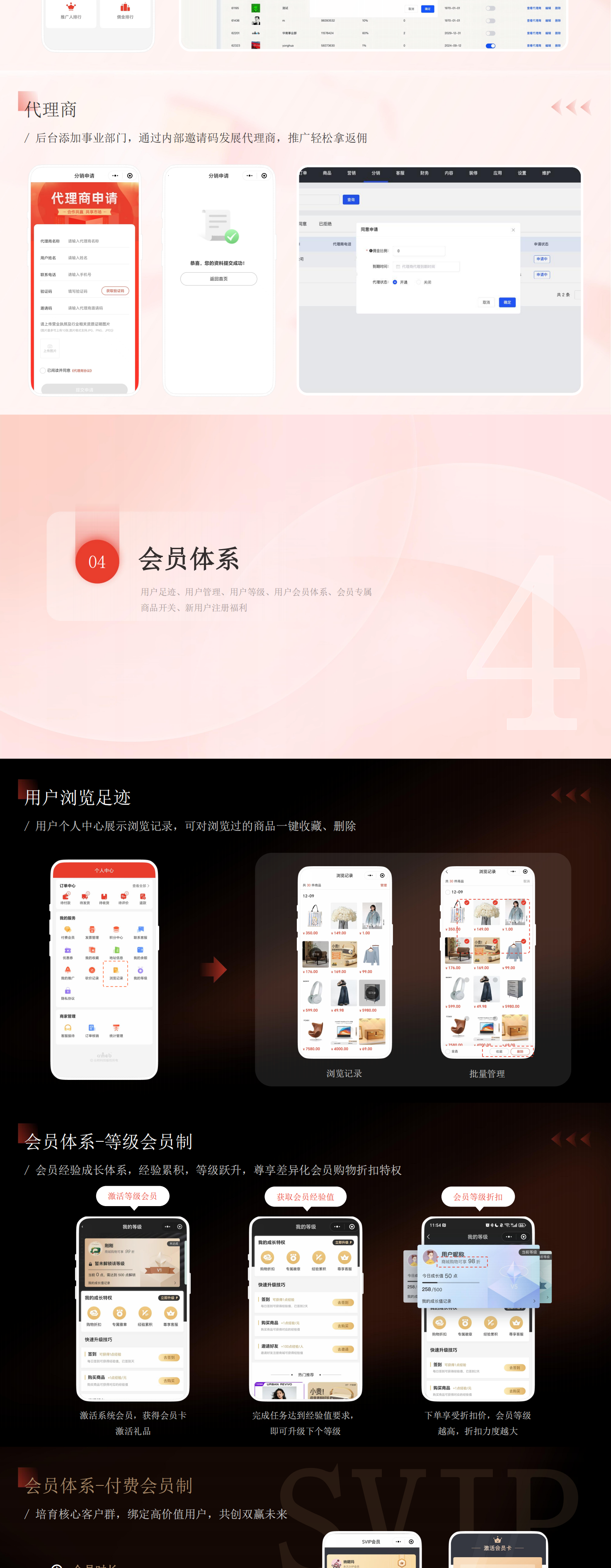 帮助中小型企业快速实现线上电商系统搭建,以社交电商为核心,借助系统完善的营销体系、分销体系拓展线上销售业务